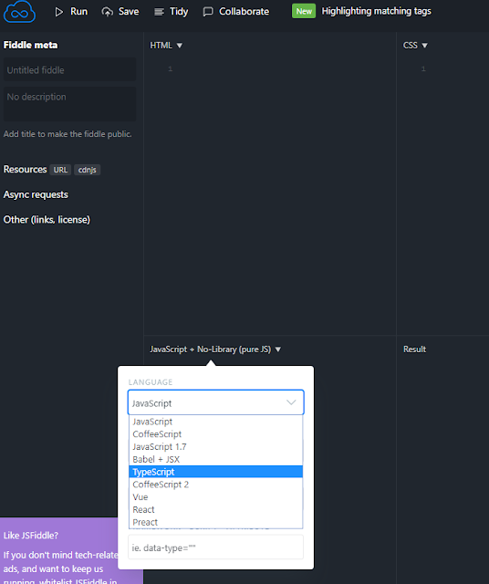 JavaScript 탭 선택 > JavaScrip 클릭 > TypeScript 선택